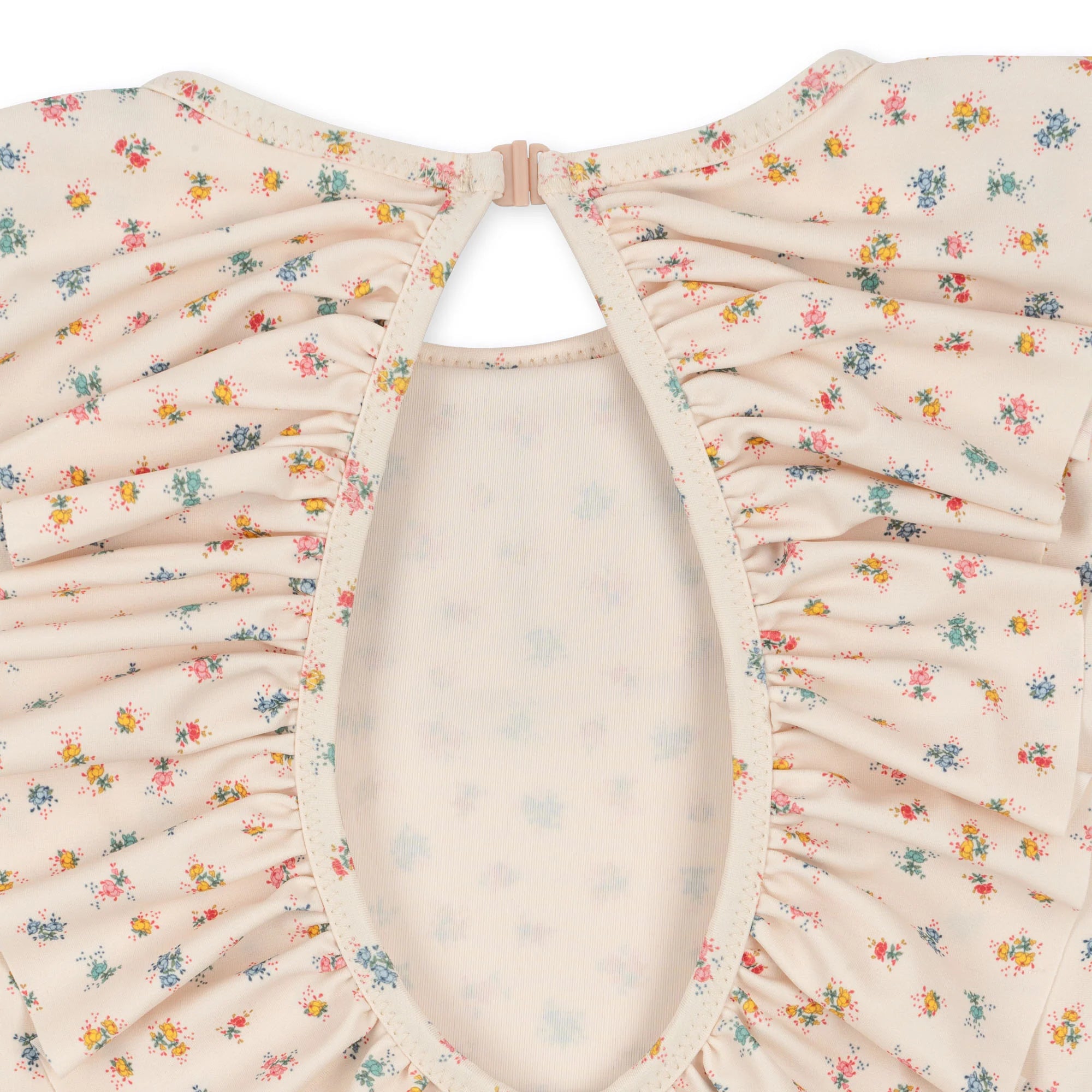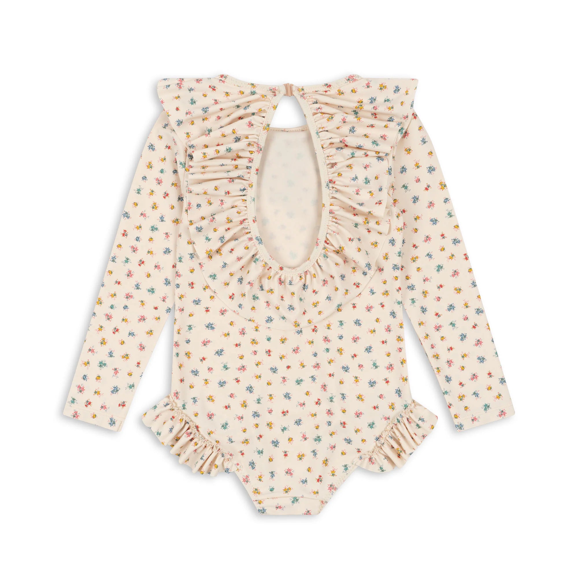 ملابس سباحة مذهلة بأكمام طويلة مصممة بياقة مجعدة كبيرة مستديرة وتفاصيل تجعيد عند فتحات الساقين.