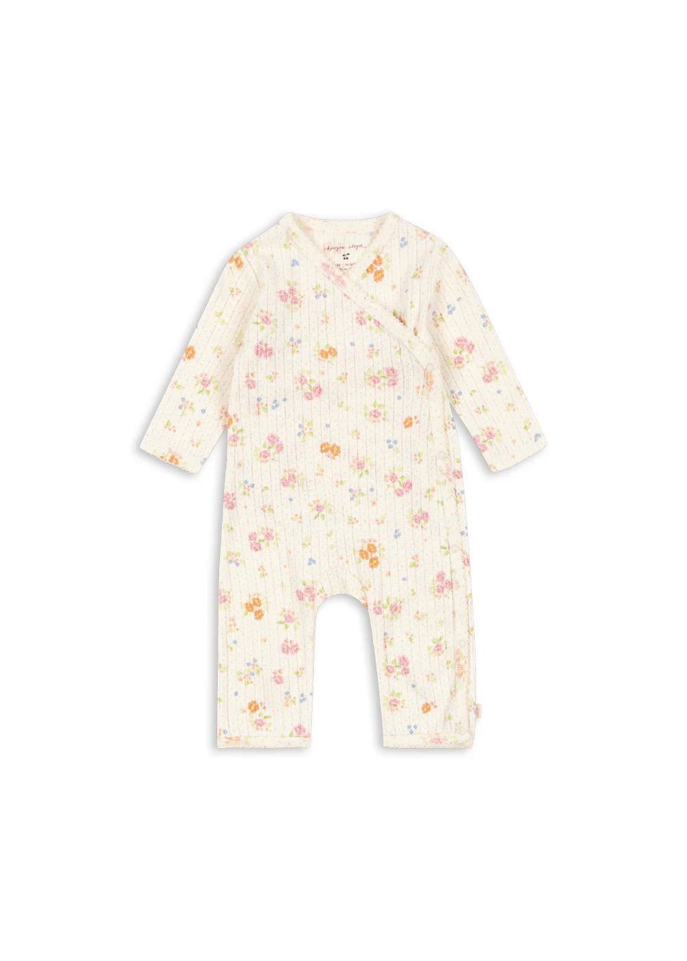 The jumpsuit is made of 95 percent organic cotton and 5 percent elastane, with a hint of stretch. Snap buttons along the sides make it easy to wrap the garment around baby.