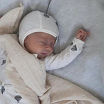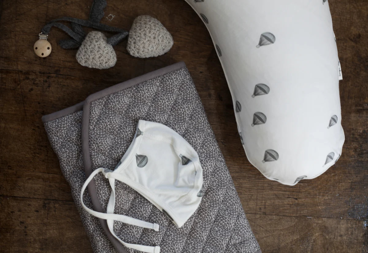 Soft helmet made in 95 percent organic cotton and 5 percent elastane, with a hint of stretch. Designed with a round shape and two straight ties allowing it to be tied under the chin.