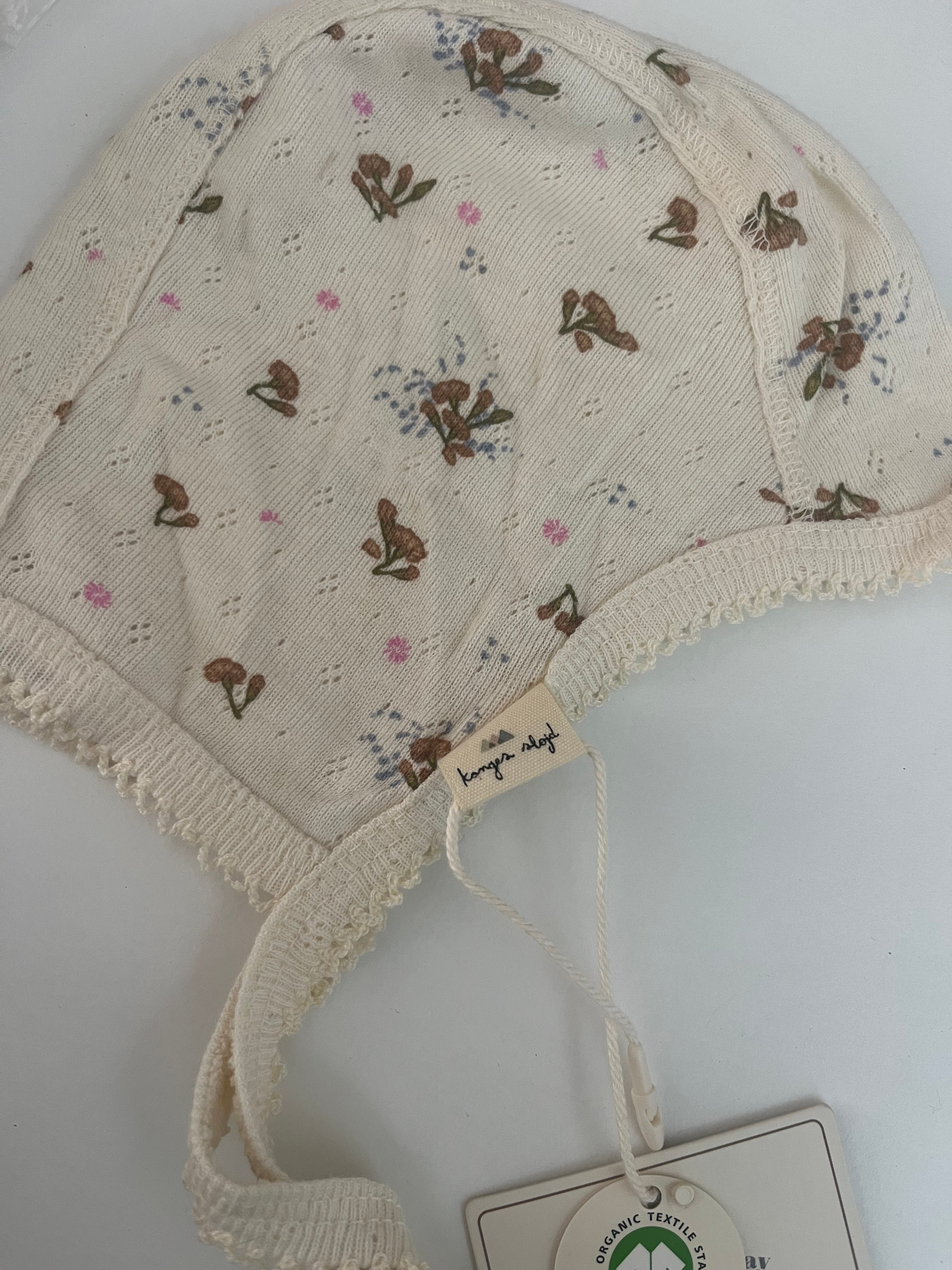 Soft helmet made in 95 percent organic cotton and 5 percent elastane, with a hint of stretch. Designed with a round shape and two straight ties allowing it to be tied under the chin.