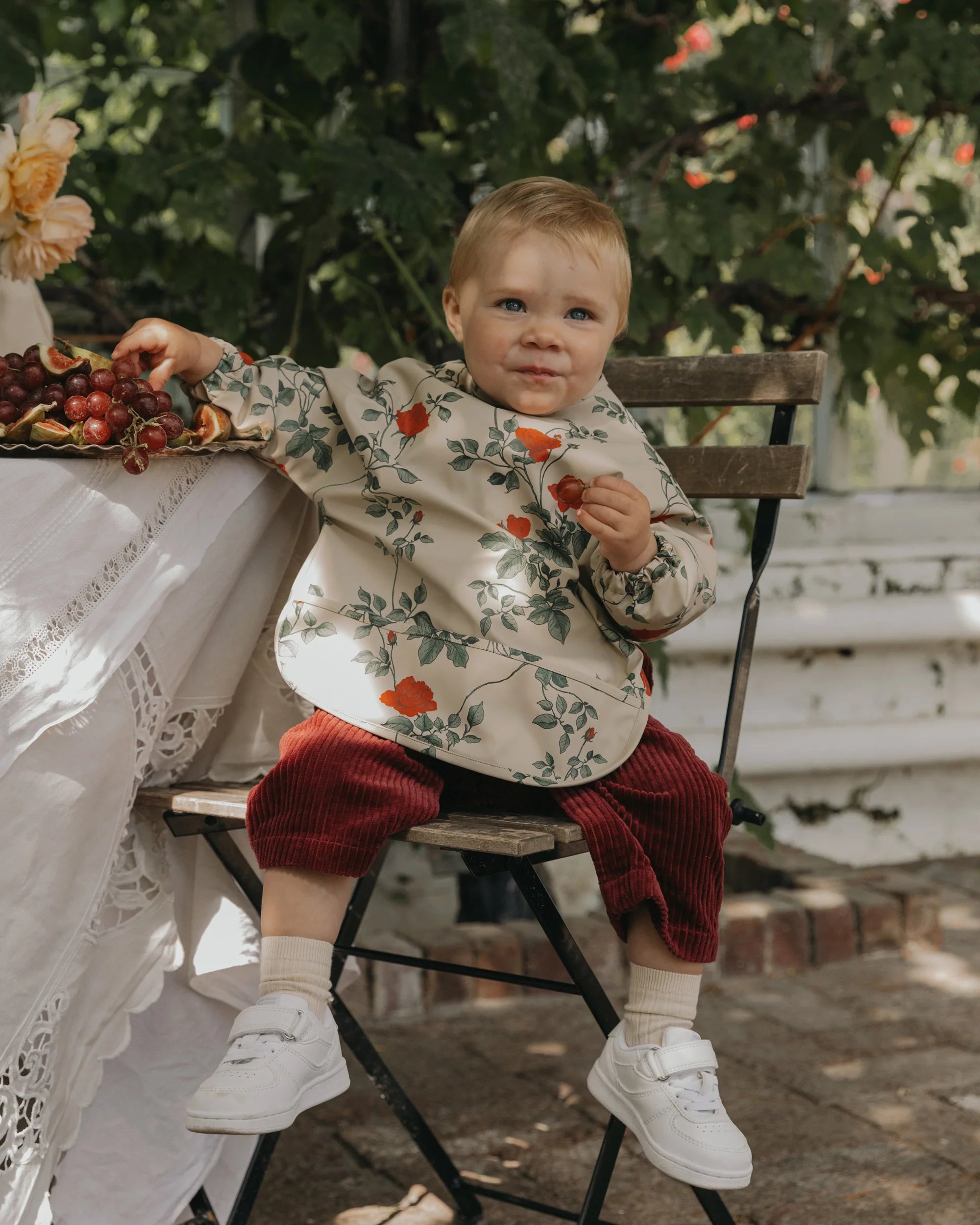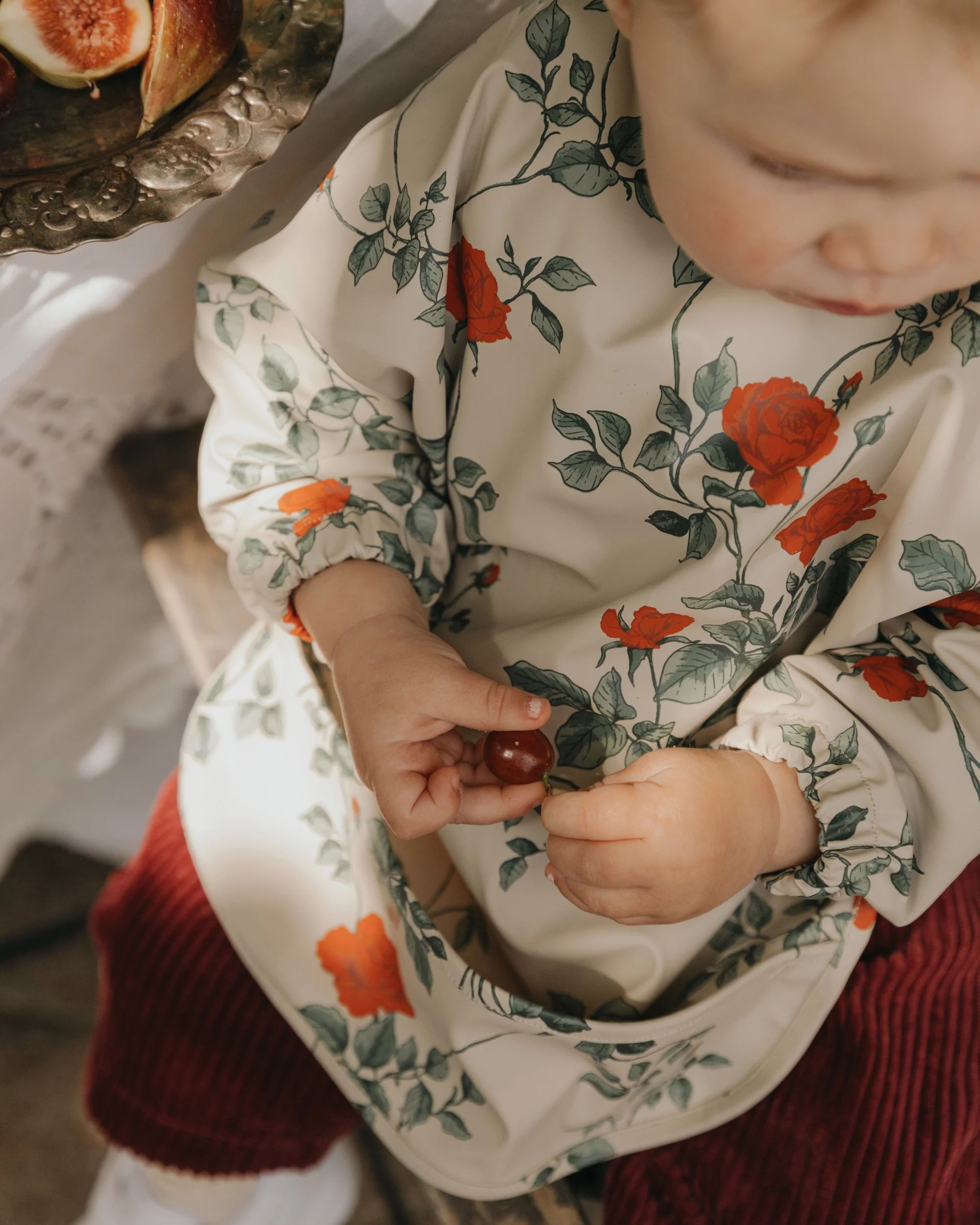 סינר קל משקל עם שרוולים ארוכים עשוי מחומר PU רך וגמיש עדין לעור התינוק. לסינר כיס קדמי פרקטי ללכידת מזון ונשפכים, כמו גם משטח עמיד למים וכתמים שקל לנגב לאחר הארוחות. גודל: 43.5x31.5 ס"מ