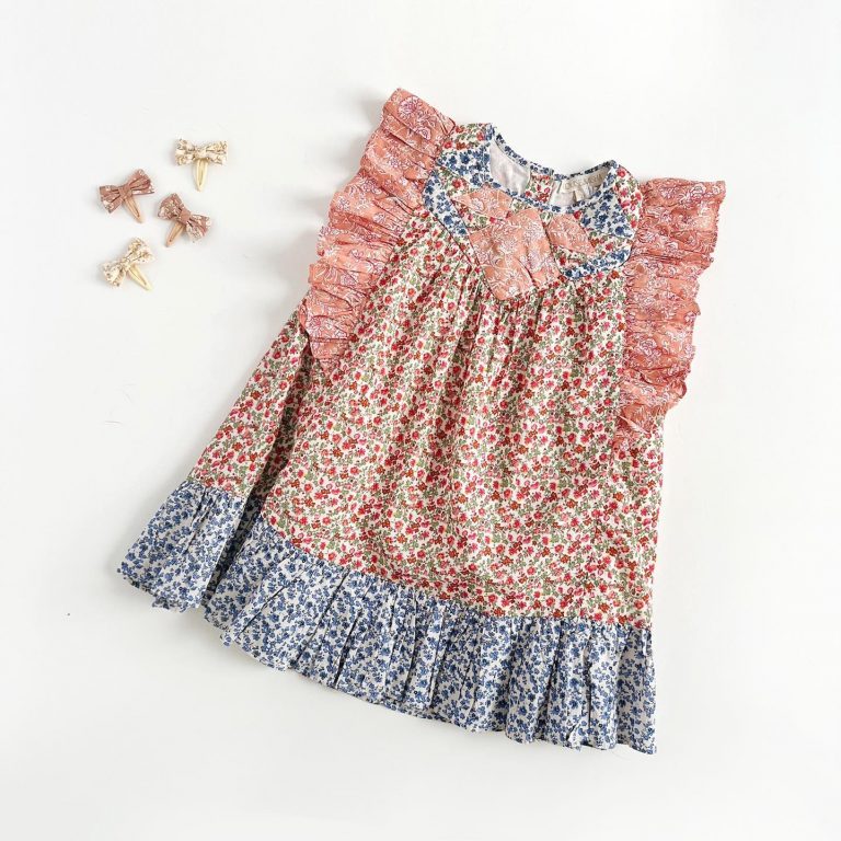 The dress is designed with various prints, ruffles are embedded in the arms.