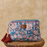 Floral print, waterproof inner lining, opening with gold zipper, colorful handmade pompoms, printed lining, inner pocket