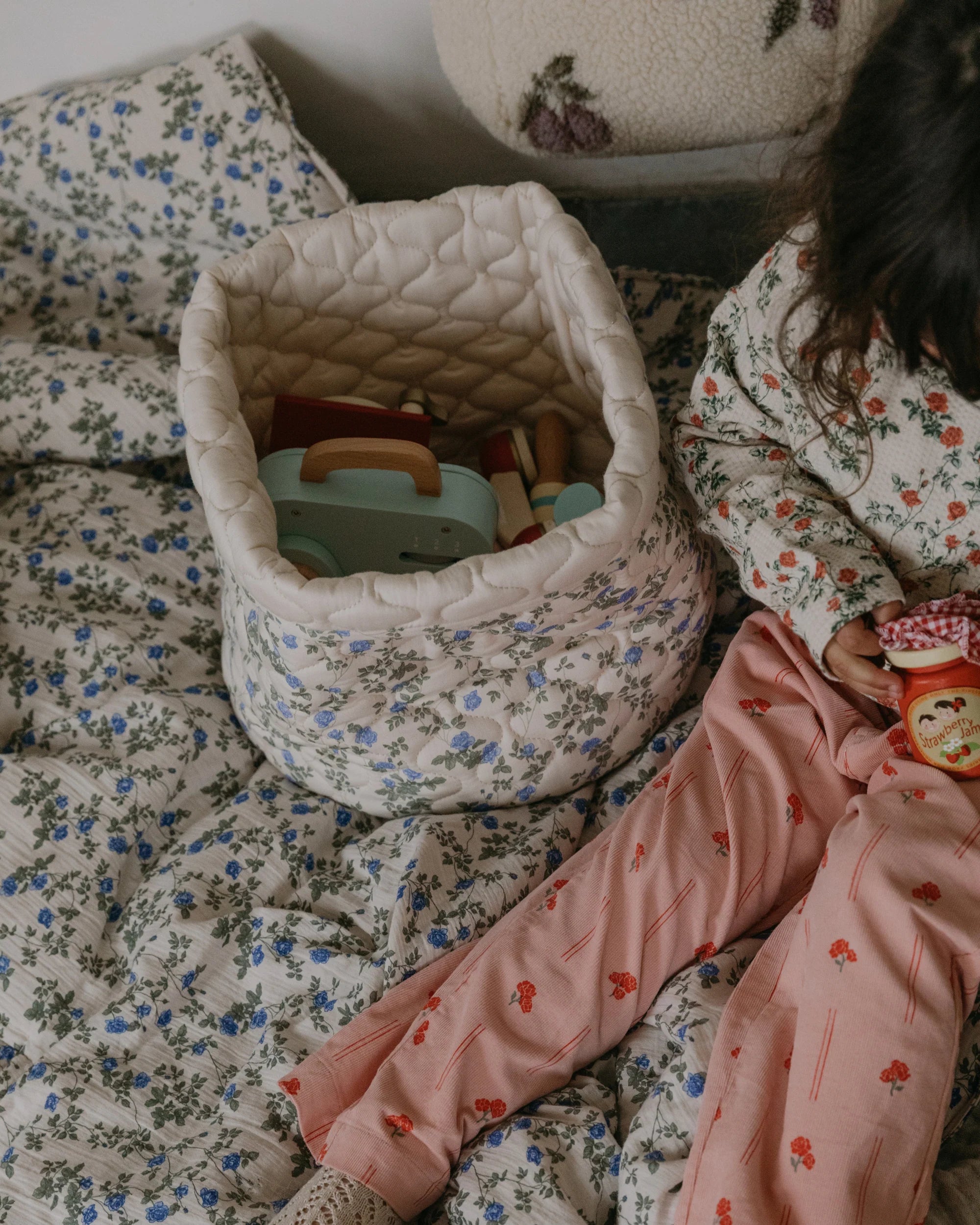 סל אחסון מרופד מבד סאטן כותנה אורגני משובח. מושלם לאחסון צעצועים, שמיכות או פריטים קטנים אחרים בבית. סל האחסון מגיע באריזה של 2 יחידות בשני גדלים שונים