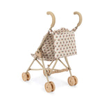 עגלת בובות מעוצבת עם רתמה, תיק נשיאה וגלגלים כפולים על ארבע הרגליים ליציבות נוספת.