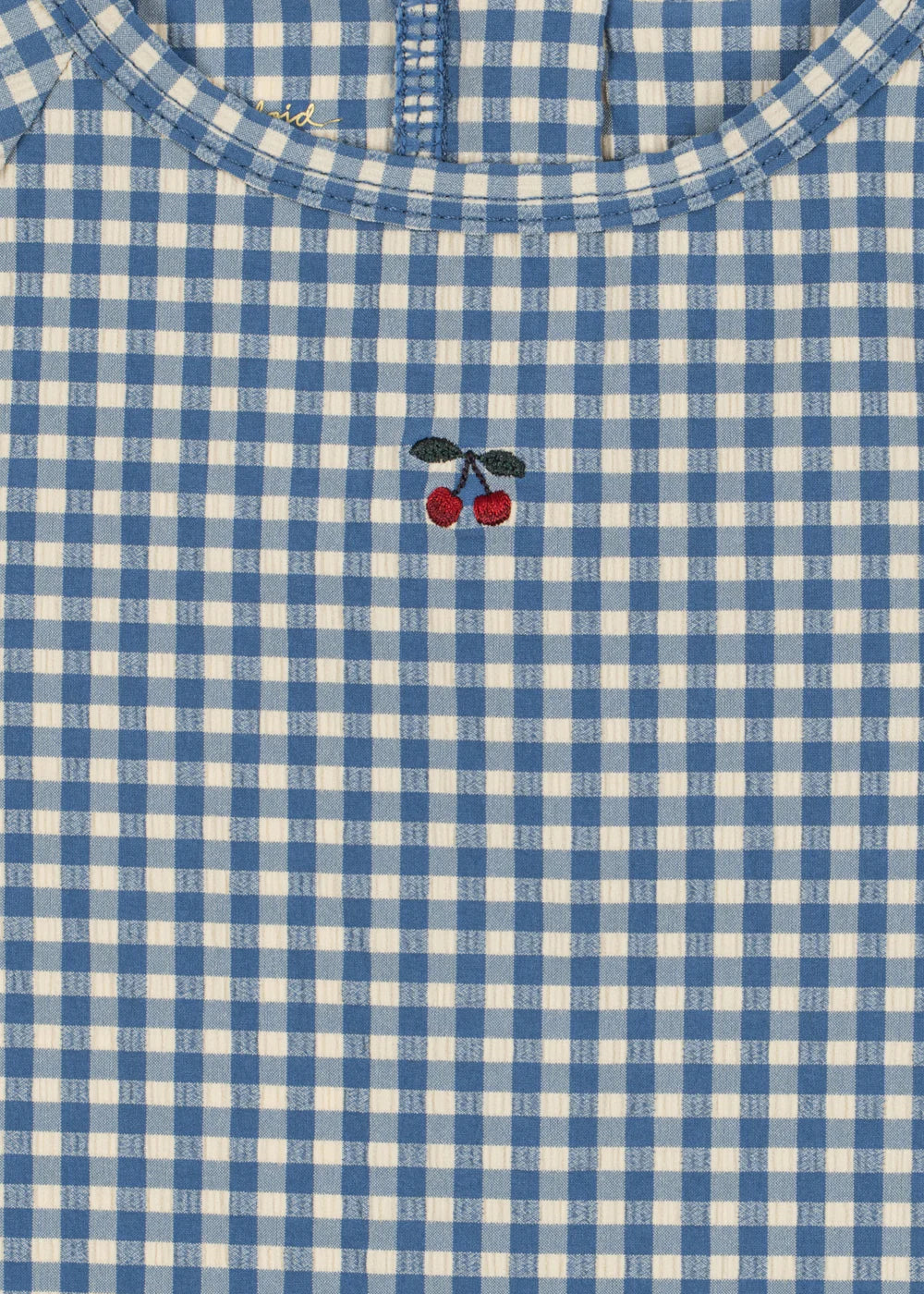 בגד ים קלאסי מבד סרסאקר בעל טקסטורה עם קפלים ופרטי נצנצים דובדבנים. עשוי מבד גמיש ומתייבש במהירות, מושלם לימים ארוכים בחוף הים או בבריכה.