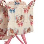 עגלת בובות מעוצבת עם רתמה, תיק נשיאה וגלגלים כפולים על ארבע הרגליים ליציבות נוספת.