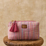 הדפס פרחוני, ריפוד פנימי עמיד למים, פתח עם רוכסן מוזהב, פונפונים צבעוניים בעבודה יד, בטנה מודפסת, כיס פנימי
